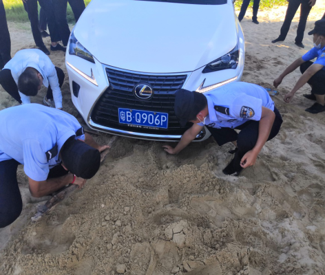 6月19日下午,当学警们正在沙滩上巡逻的时候 ,也遇到了同样的事情,下图是学警们合力帮助游客推深陷在泥沙里的车。这次好像比上次困难了许多,尽管手边没有可以挖沙的工具,但他们还是想办法找来了树干,用树干一点点的将泥沙刨了出来。